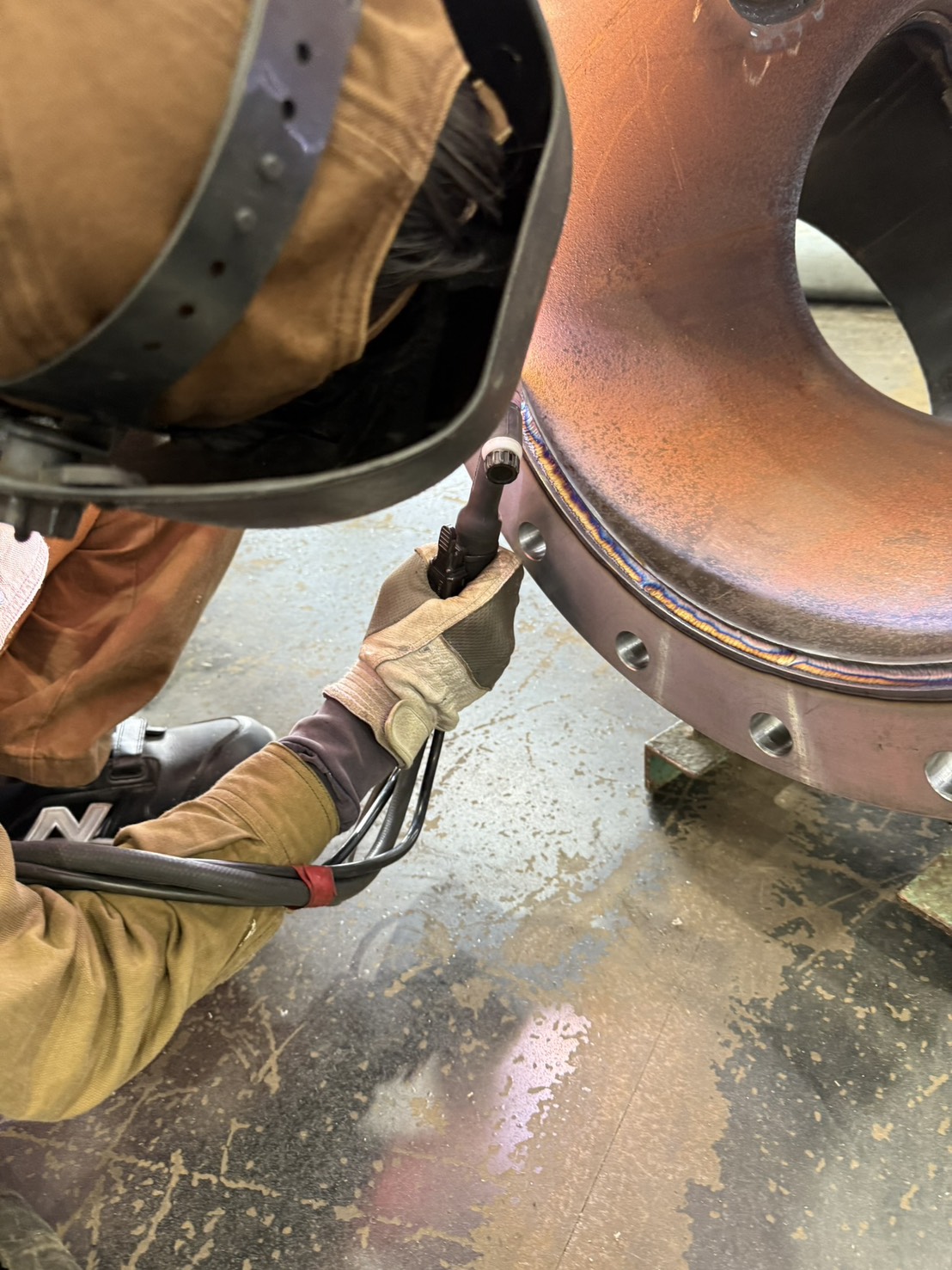下の写真は、配管とフランジの接合部を、TIG溶接で仕上げているところです。