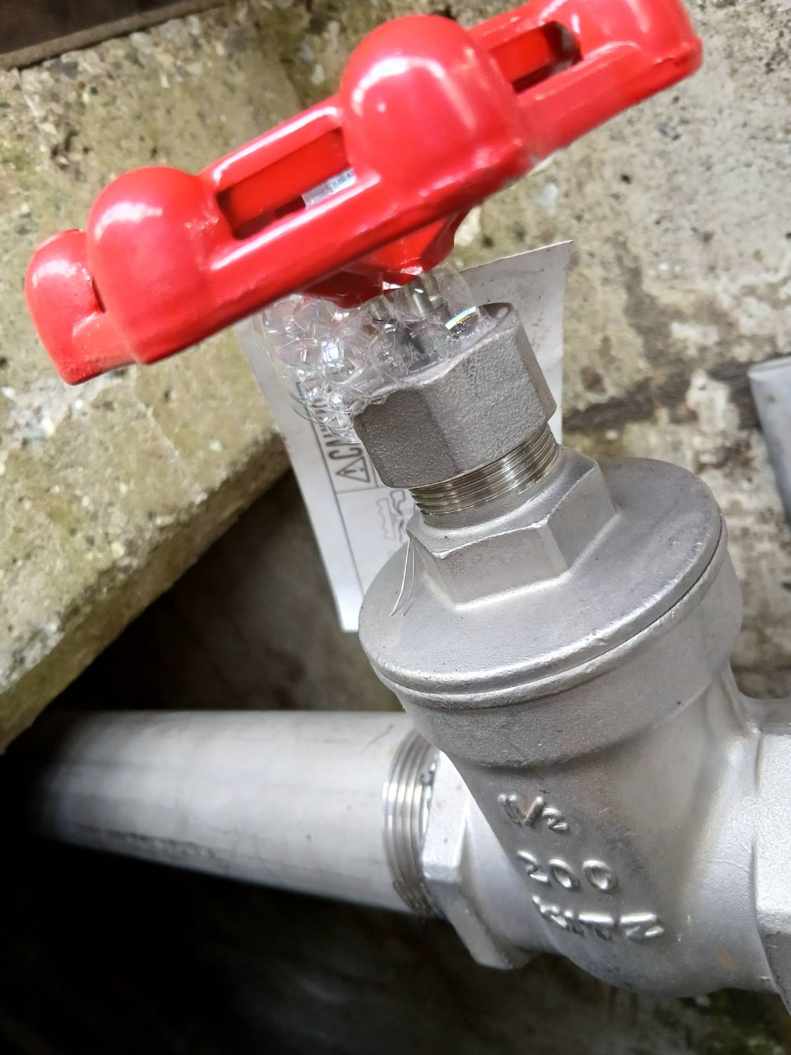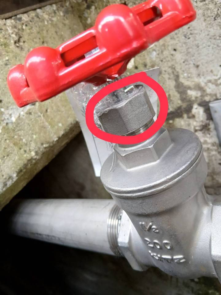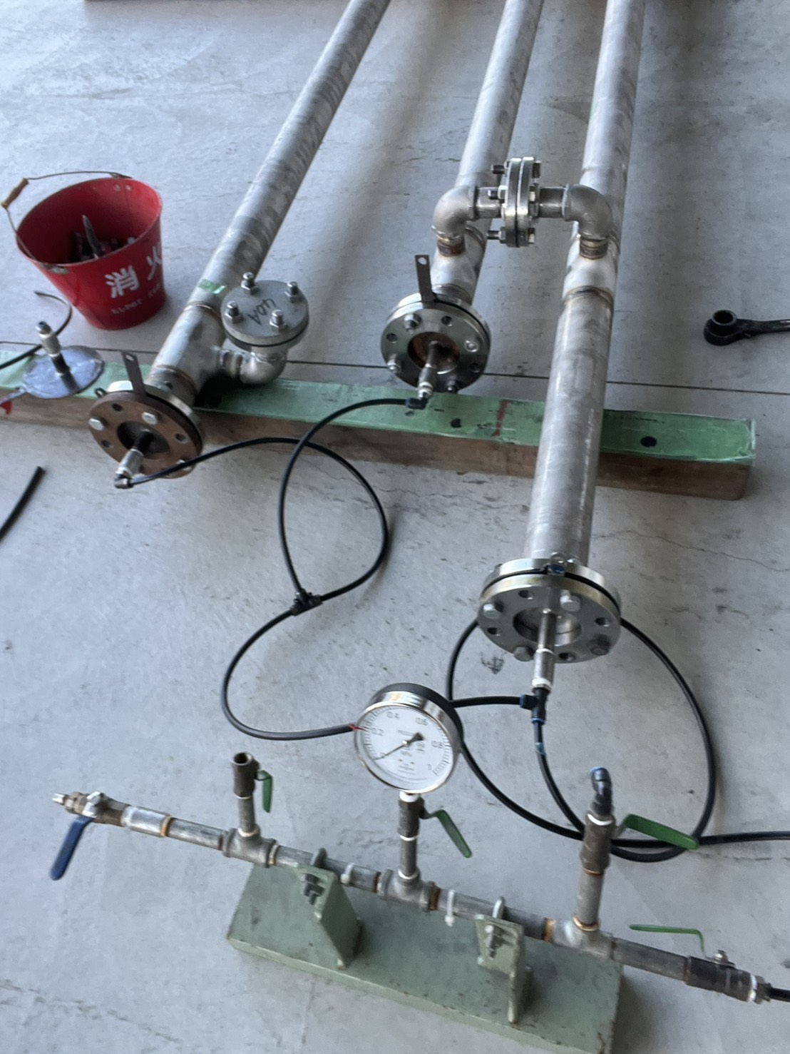 写真は製作後の配管と、実際に圧力をかけて確認している様子です。